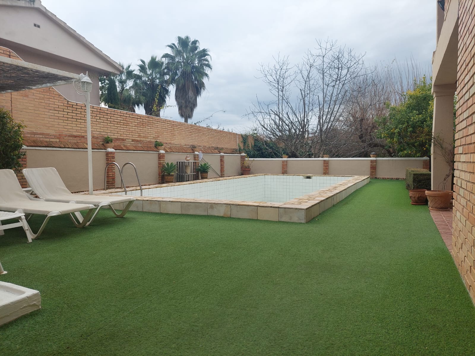 La parcela que lo alberga es de 1.260m2 y cuenta con jardín consolidado, piscina(40m2) y pequeñas construcciones anexas( Trasteros, lavadero y tendedero, leñera. ) y zona de parking cubierta para 2 vehículos, barbacoa.