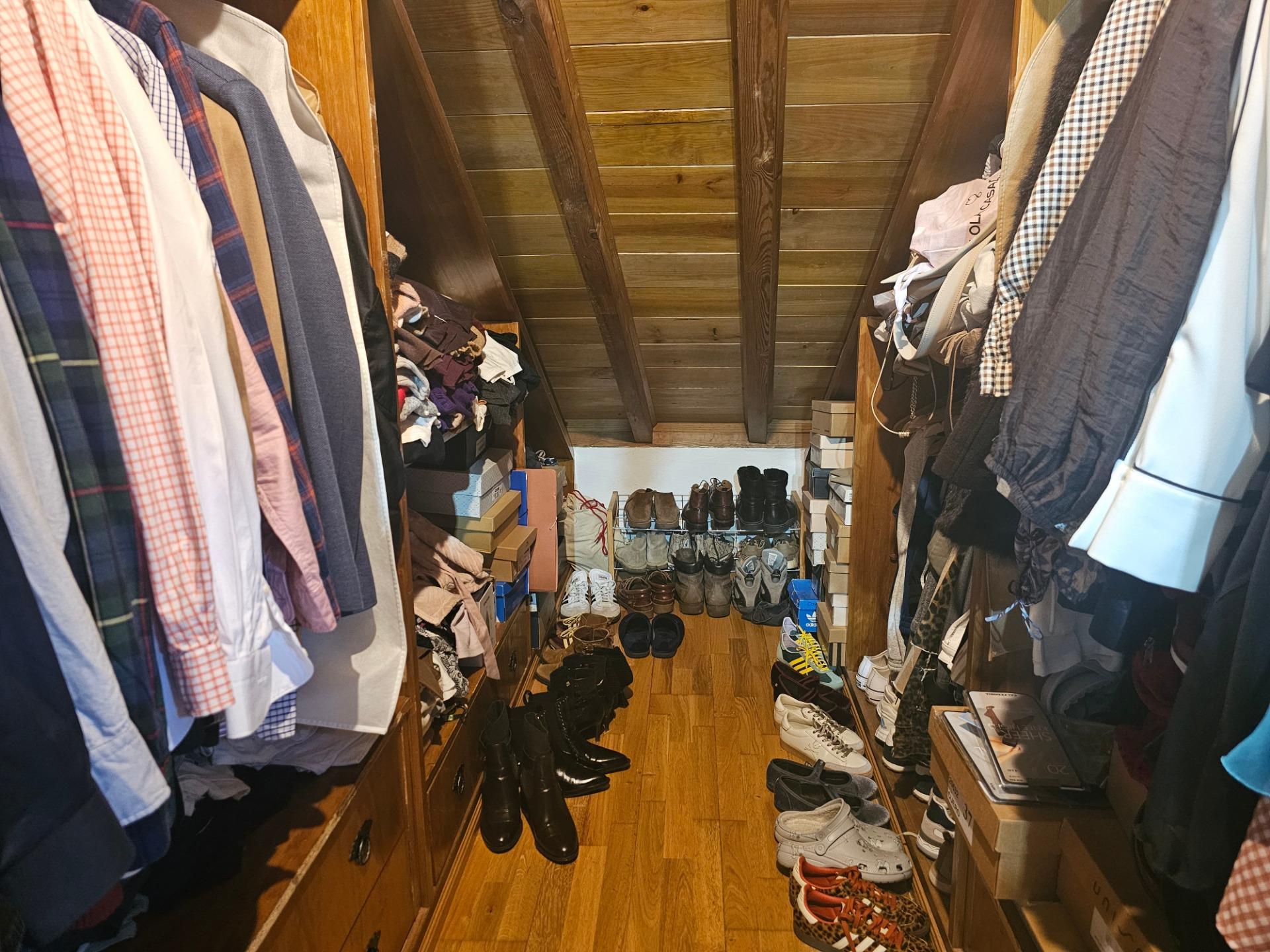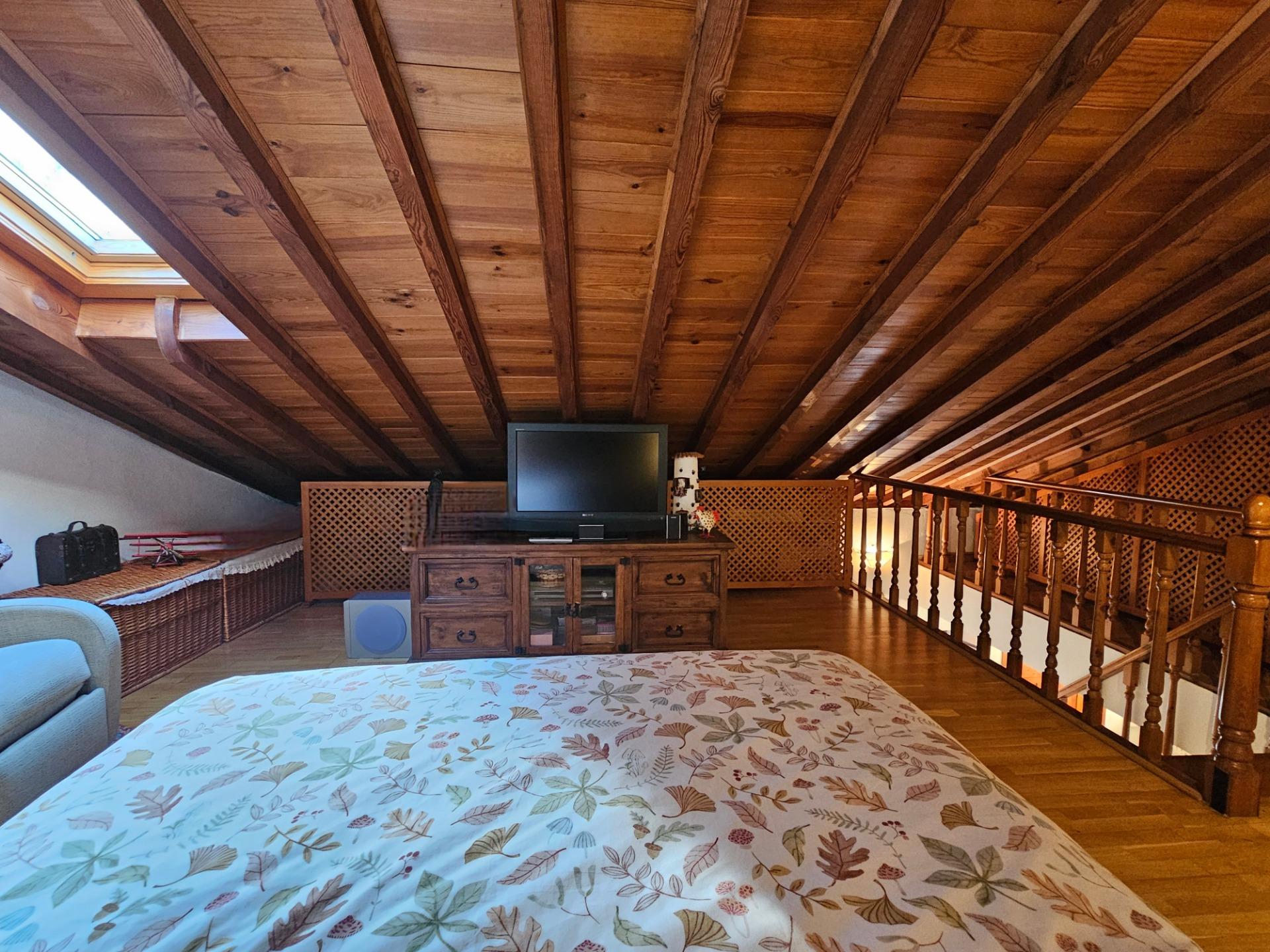 La vivienda se encuentra en primera planta, y se distribuye en planta principal, dónde tenemos un acogedor salón-comedor, una cocina independiente, un baño y dos dormitorios, uno de ellos especialmente amplio. Desde el salón tenemos una coqueta escalera de madera que da acceso a la impresionante suite de casi 60 m2, que actualmente está adecuada para un espectacular dormitorio principal con baño en suite y gran vestidor, además de disponer de mucho espacio para almacenamiento. Esta suite abuhardillada destaca por su espectacular techo de vigas de madera vista, que crea una atmósfera cálida y elegante a la vez.