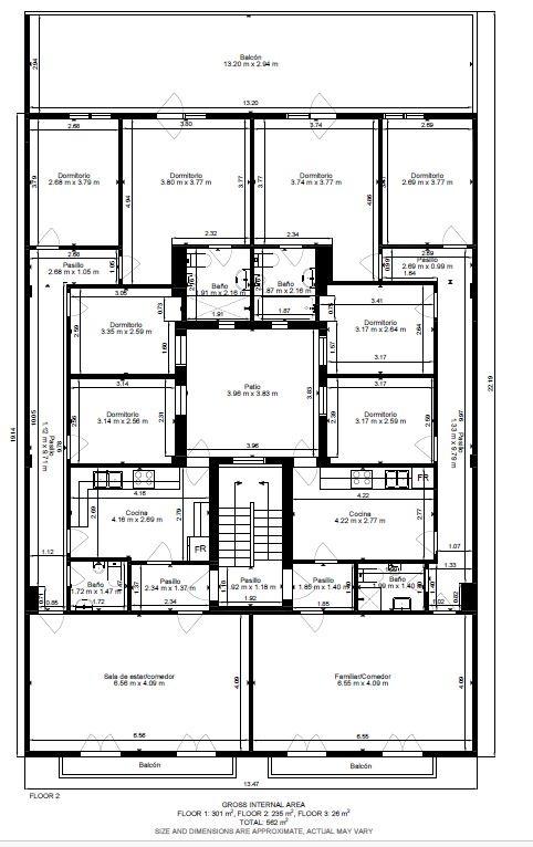 En la planta alta: Dos viviendas independientes y simétricas, ideales para familias numerosas o para alquiler. Cada vivienda dispone de: Vestíbulo, salón-comedor, cocina independiente, pasillo distribuidor, cuatro dormitorios, dos cuartos de baño, patio interior y caja de escaleras. A destacar la ventilación cruzada y la orientación (este-oeste) del inmueble.
